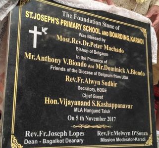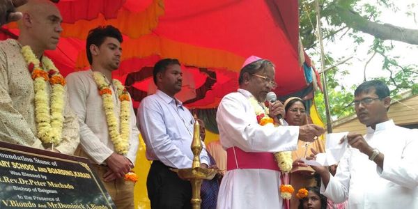 Bishop Peter Machado with the help of Fr. Melwyn D'Souza presides over the dedication of the foundation stone for the St. Joseph's English Medium & Boarding School. The land is owned by the diocese and is a half of block down the road from the church. This property is also adjacent to the convent.